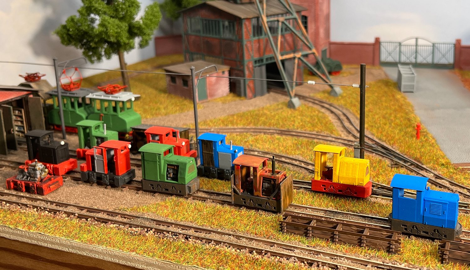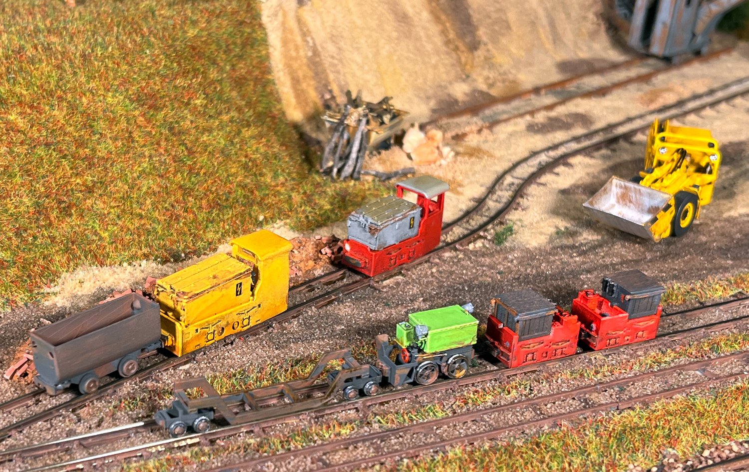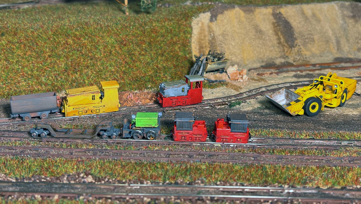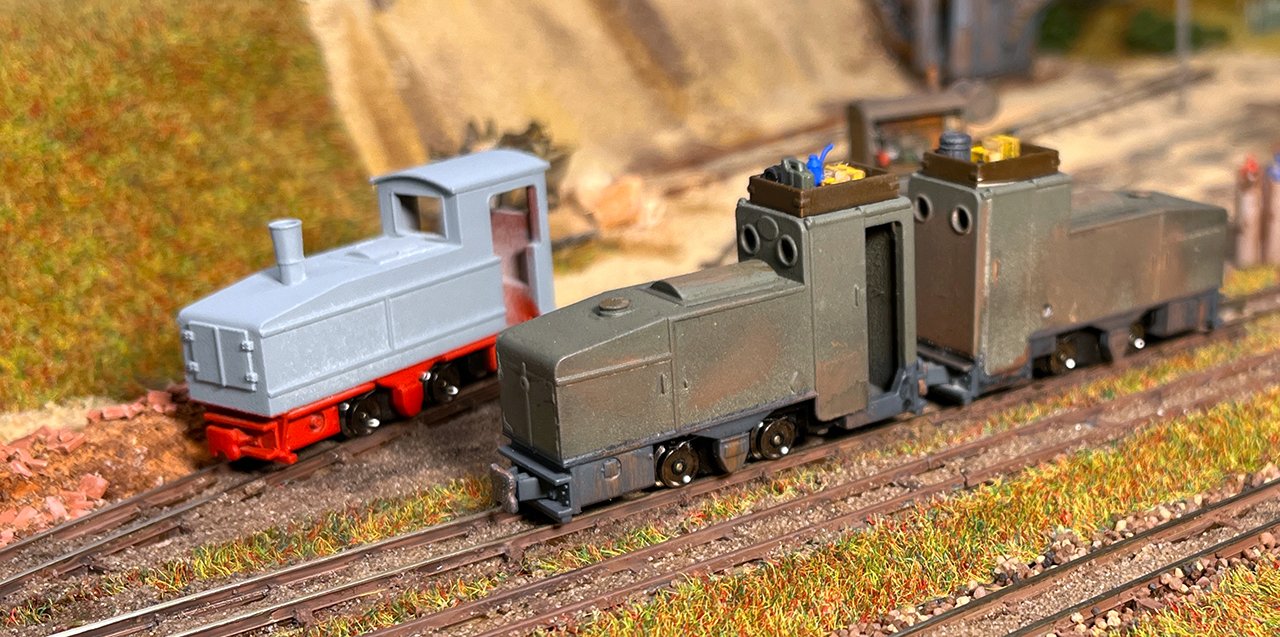 NEU 170 Vorn die kleinsten Akku-Loks in meinem Museum: Links ein Karlik (Bausatz micro_miners) sowie zwei Siemens 1A2, bemerkenswert der Universalfahrlader als Fertigmodell von micro-miners. |