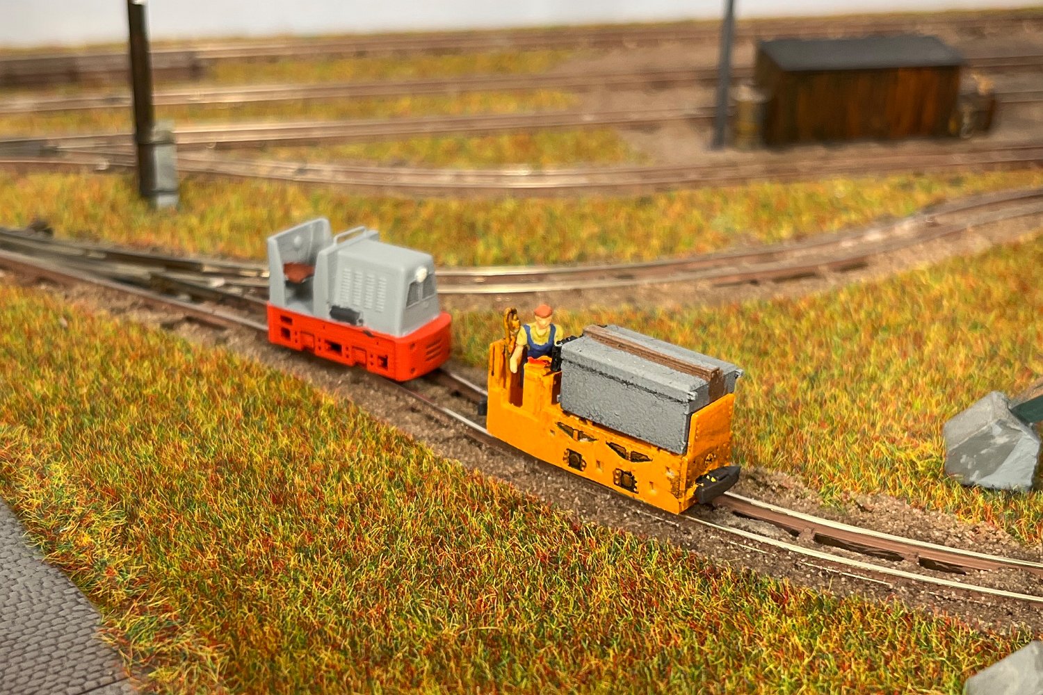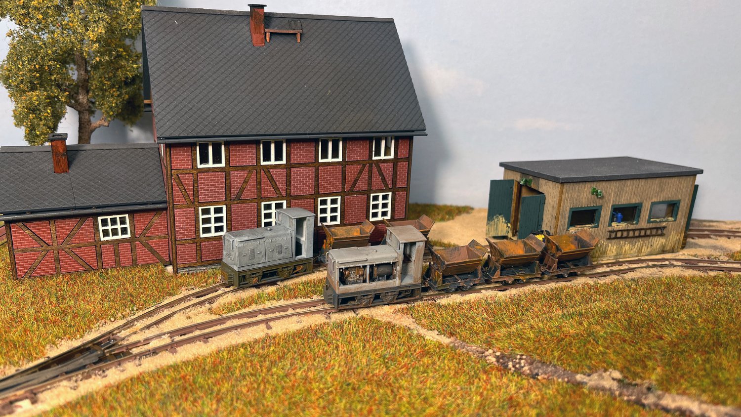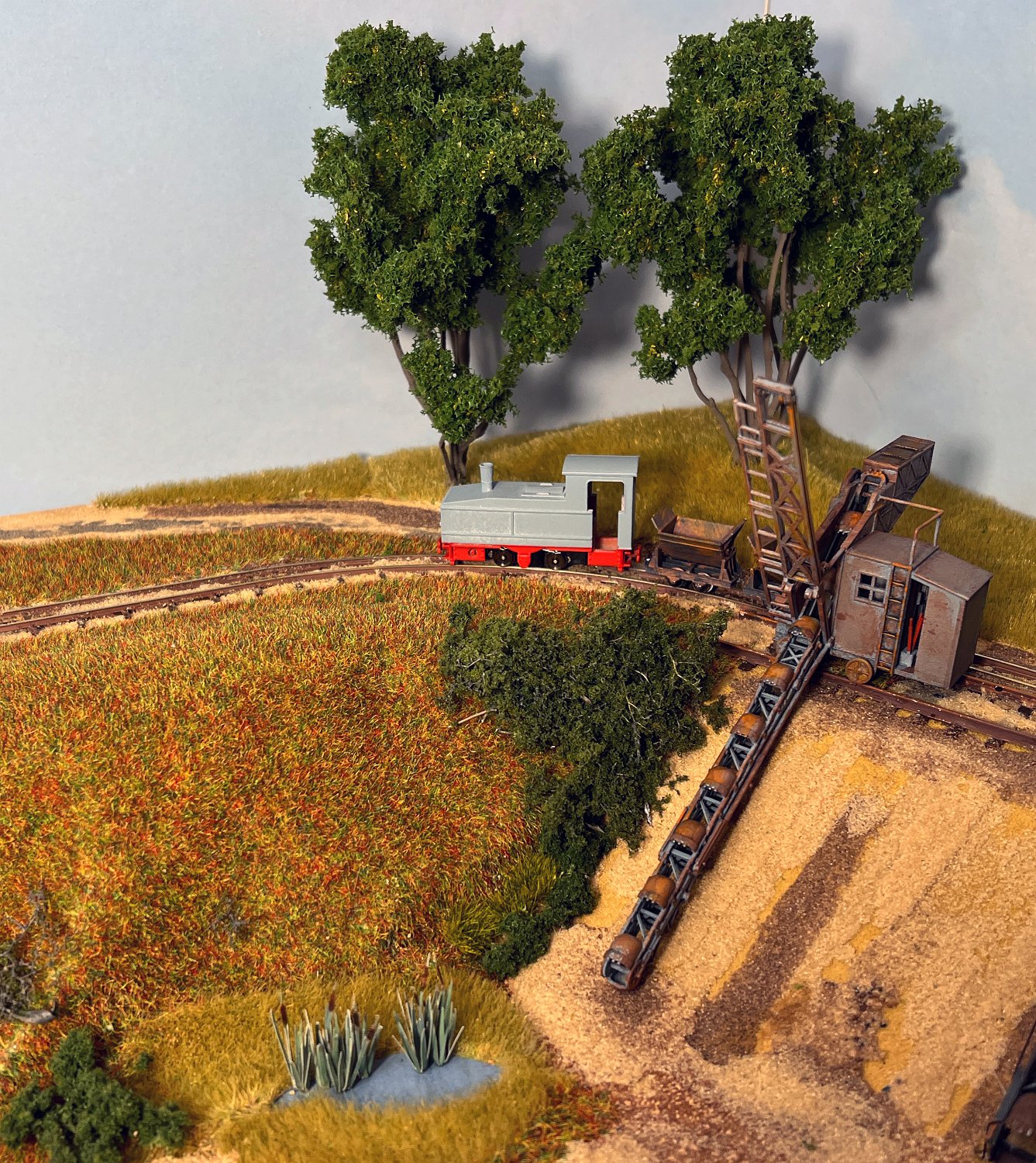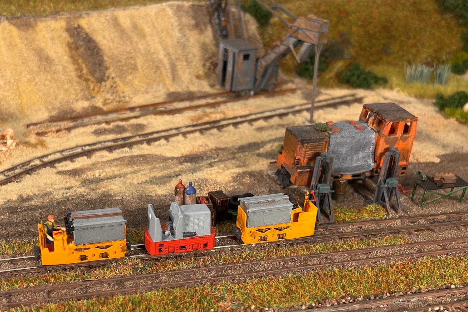 11 Die Lokschuppen ohne Details, der Busch-Bagger steht noch lose und schief, aber es ging gut weiter. Die 20-PS-Simplex ist derzeit mein kleinstes rollfähiges Lok-Modell und wird hier vom Ziegelbruch-Geisterwagen geschoben. |