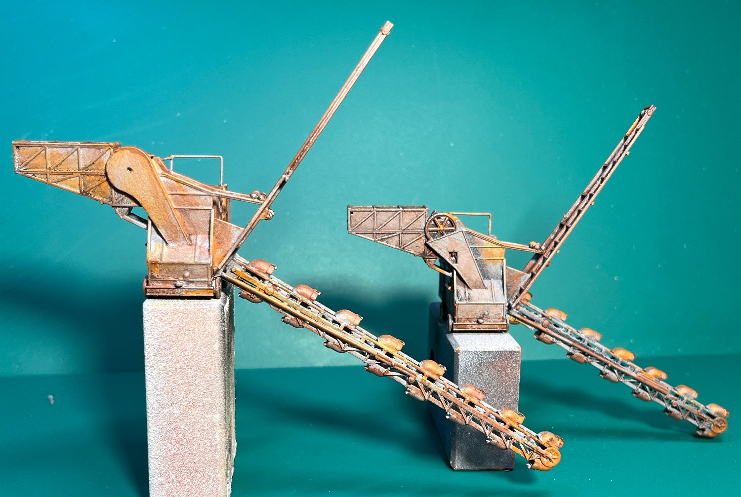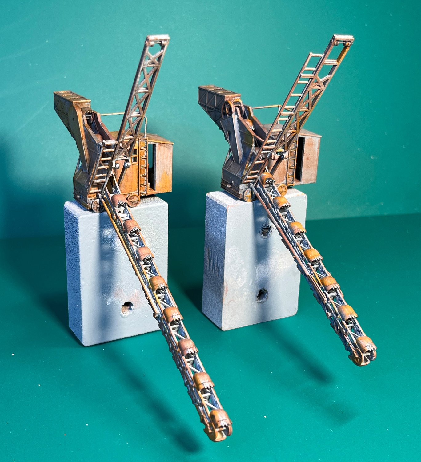 NEU 143 Mein Eimerkettenbagger in zwei Varianten: Der Linke 1972 in der Ziegelei Winningen vermessen, war für das Diorame zu groß. So entstand nach Fotos aus Mildenberg eine Variante mit kürzerem Ausleger. |