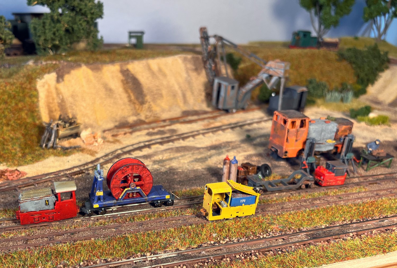 30 Die untere Ebene macht Fortschritte: Auf einer Winde wartet ein V10C auf die Aufarbeitung, am Tümpel wächst Schilf und der zweite Bagger steht endlich mit straffen Seilen richtig eingegleist da. |